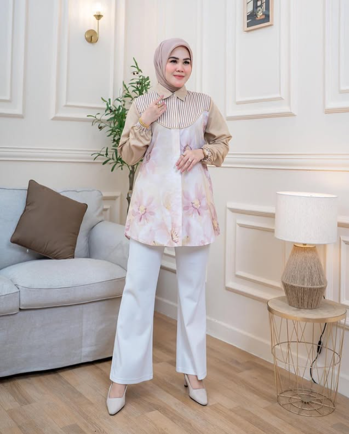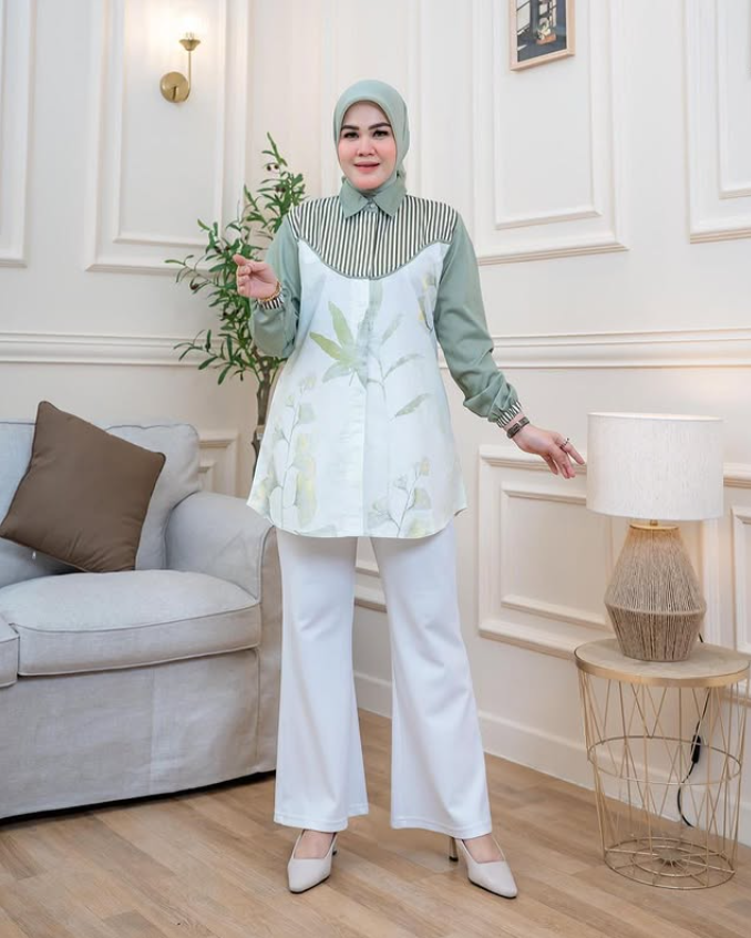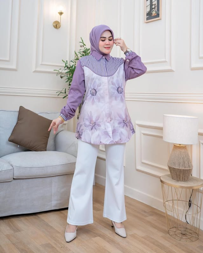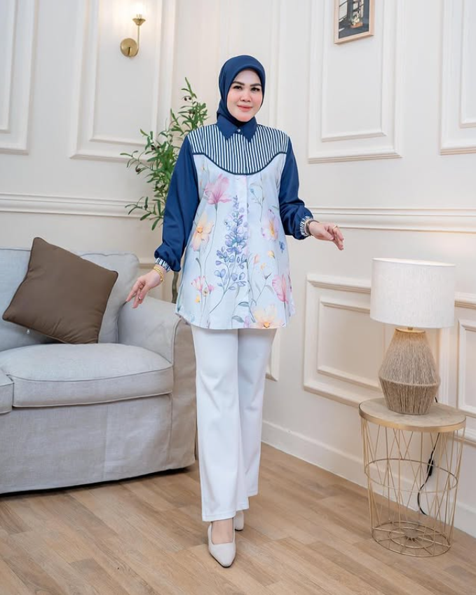 Look elegant and stylish with the Elegant Floral Muslimah Blouse, the perfect choice for women who want to stay fashionable while maintaining comfort. Designed with a combination of sophisticated floral prints and modern stripes, this blouse is perfect for both formal events and casual outings.